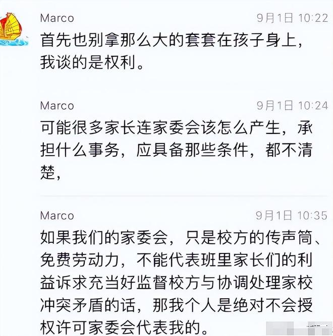 首先他提到的是权力,他指出很多家长连家委会该怎么产生承担什么事物,应具备哪些条件都说不清楚,他明确的告诉大家,家委会不是学校的传声筒,更不是家长们的免费劳动力,家委应该是家长们权益诉求充当好监督校方与协调处理家校冲突的桥梁。