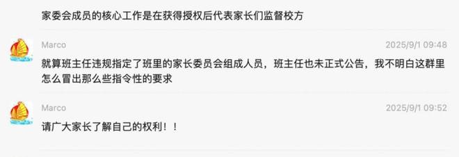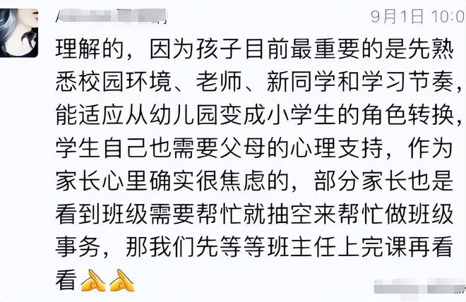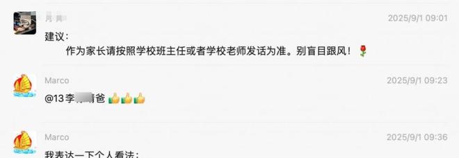 另外一名家长也跟着说,作为家长,请按照学校班主任或者学校老师发话为准,别盲目跟风。