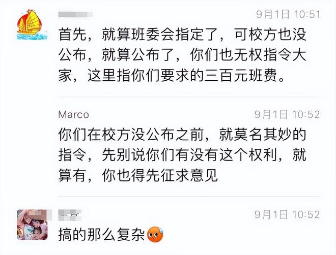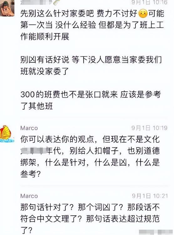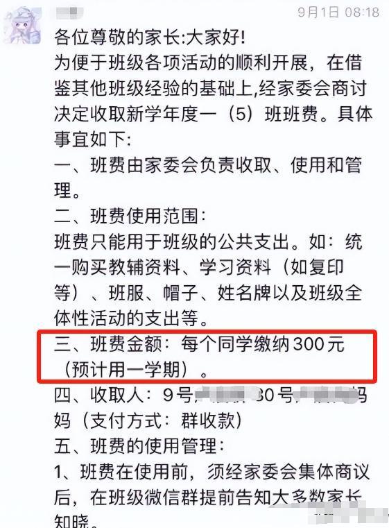 这一次导火索是开学第1天,家委在群里发布了一则通知,通知的大概内容就是,为了便于班级各项活动的顺利展开,家委会通过商讨,决定由家委代收,负责班级班费,班费的主要用途用于公共支出,如购买辅导资料,学习资料,班服、帽子,姓名牌等,家委会借鉴其他班的经验,向每位家长收取300元的费用。