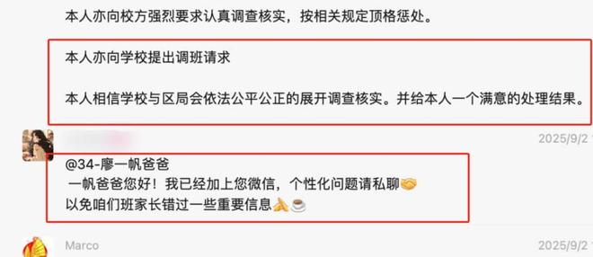 班主任见事情闹大了,立刻添加廖一帆爸爸微信,但是廖一帆爸爸直接在群里答复:已经没有必要了,走程序吧。