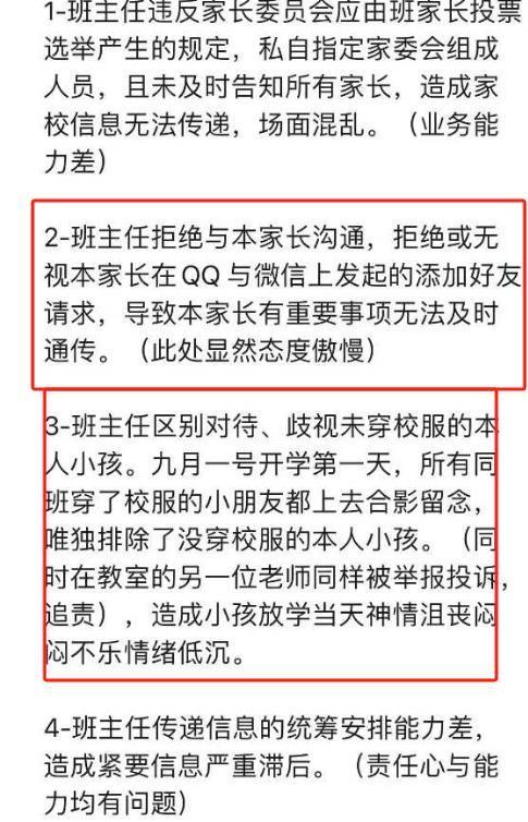 原因如下,举出了1234点,其中第3点是因为开学第1天,由于廖一帆没有穿校服被区别对待的事情,另外134点就是有关于班主任的问题。